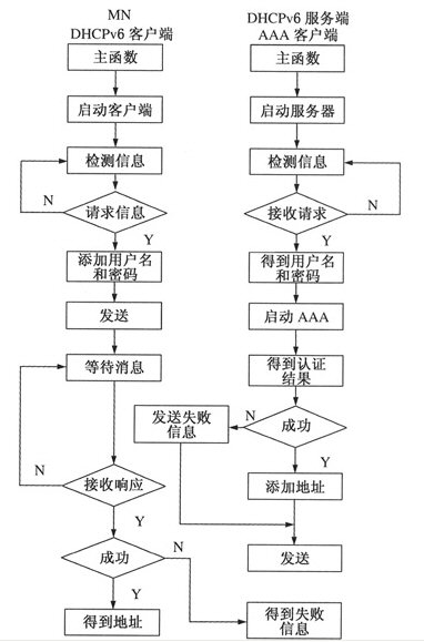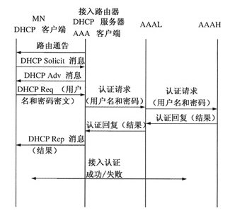 本方案認(rèn)證機(jī)制在比較上述幾種認(rèn)證機(jī)制的優(yōu)缺點(diǎn)的基礎(chǔ)上,根據(jù)層次移動(dòng)IPv6的網(wǎng)絡(luò)特性和運(yùn)行需求,采用IPv6的動(dòng)態(tài)主機(jī)配置協(xié)議(DHCPv6)結(jié)合AAA協(xié)議來完成AAA認(rèn)證和地址分配過程。該機(jī)制工作在網(wǎng)絡(luò)層,不依賴鏈路層協(xié)議,有利于移動(dòng)節(jié)點(diǎn)用多種方式接入網(wǎng)絡(luò),具有兼容性好、利于向高層協(xié)議擴(kuò)展、實(shí)現(xiàn)簡單、容易控制、與移動(dòng)IP結(jié)合性好等優(yōu)點(diǎn)。