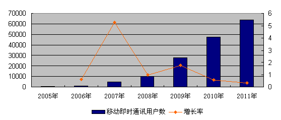 中國(guó)移動(dòng)即時(shí)通訊用戶(hù)規(guī)模發(fā)展?fàn)顩r(2005-2011)