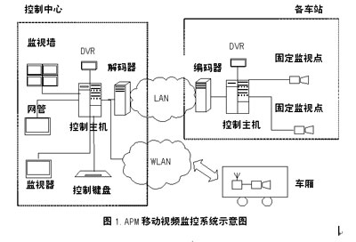 移動視頻監(jiān)視系統(tǒng)主要包括前端設備、后端設備和傳輸設備組成。前端設備主要指圖像攝取設備(如各種類型的攝像機),后端設備主要指圖像顯示、圖像錄制、系統(tǒng)控制等設備,前后端需要通過傳輸系統(tǒng)連接。為了支持系統(tǒng)的移動功能,傳輸環(huán)節(jié)中至少有一部分是無線傳輸系統(tǒng)。APM移動視頻監(jiān)控系統(tǒng)的組成如圖1所示。
