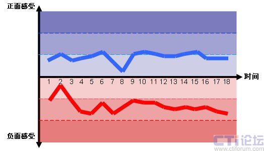 圖2的情感曲線分別是中國移動的“喜愛”情感曲線和中國電信的“討厭”情感曲線,對應(yīng)于雙方整個呼入電話體驗18個子流程上的情感感受。(注意,我們只列出了中國移動的“喜愛”曲線和中國電信的“討厭”曲線來舉例說明。) 一次電話呼入體驗的所有子流程列表如下: