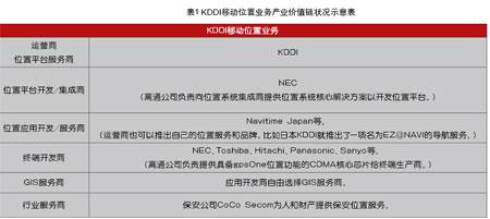 以日本KDDI為例,移動位置業(yè)務(wù)的產(chǎn)業(yè)價(jià)值鏈狀況如表1所示。