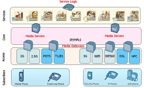 在下一代增值業(yè)務(wù)網(wǎng)絡(luò)里,業(yè)務(wù)平臺(tái)由一系列不同功能的應(yīng)用服務(wù)器組成,同時(shí)為固網(wǎng)/移動(dòng)/IP客戶提供增值業(yè)務(wù)。以彩鈴業(yè)務(wù)平臺(tái)為例,彩鈴的簽約用戶可以是移動(dòng)用戶,也可以是固定電話,小靈通用戶或IP用戶;系統(tǒng)也會(huì)根據(jù)終端的能力和簽約類型,自動(dòng)選擇是提供音頻彩鈴或視頻彩鈴業(yè)務(wù)。