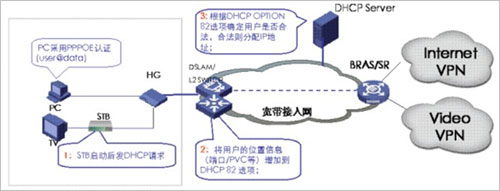當(dāng)網(wǎng)絡(luò)設(shè)備收到STB的DHCP請求報(bào)文時(shí),需要在報(bào)文后添加OPTION82字段,此時(shí)有兩種模式進(jìn)行DHCP+認(rèn)證,一種是直接把DHCP報(bào)文送給DHCP服務(wù)器,由DHCP服務(wù)器根據(jù)OPT82字段來判斷該用戶是否為合法用戶,從而決定是否為其分配IP地址。另一種是DHCP報(bào)文先送到BRAS,由BRAS將OPT82字段放到RADIUS的一個(gè)子域里,通過RADIUS服務(wù)器來進(jìn)行用戶合法性認(rèn)證,若用戶合法,再由DHCP服務(wù)器分配IP地址。