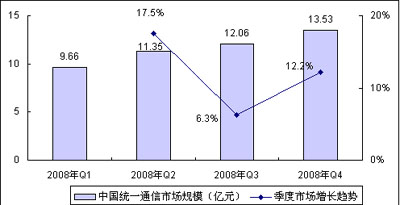 賽迪顧問預測,2008年全年中國統(tǒng)一通信市場都將保持快速的增長勢頭,雖然第三季度增長趨勢有所放緩,全球金融海嘯的反作用將進一步提高企業(yè)對統(tǒng)一通信產品的認知,促進中國統(tǒng)一通信市場的發(fā)展,第四季度市場將出現(xiàn)反彈趨勢,增長速度超過12%,市場規(guī)模13.53億元,2008年全年中國統(tǒng)一通信市場規(guī)模將達到46.6億元,同比增長超過50%。