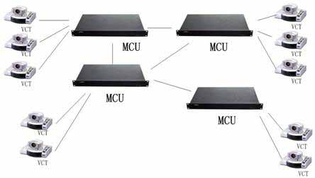 多MCU連接星型組網(wǎng)結(jié)構(gòu)見圖所示,其中VCT是視頻會(huì)議終端VideoConferenceTerminal的縮寫