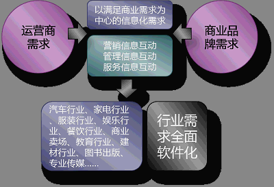 基于這個(gè)需求,那么運(yùn)營(yíng)商更需要的是針對(duì)行業(yè)版的解決方案,有許多的行業(yè)正在期待獲得這樣的商業(yè)信息化平臺(tái),包括:汽車(chē)行業(yè)、家電行業(yè)、服裝行業(yè)、娛樂(lè)行業(yè)、餐飲行業(yè)、商業(yè)賣(mài)場(chǎng)、教育行業(yè)、建材行業(yè)、圖書(shū)出版、專(zhuān)業(yè)傳媒等。