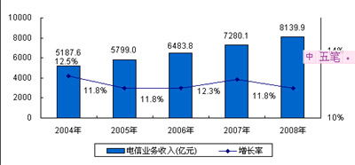 圖1 2004-2008年中國電信業(yè)務收入及增長情況