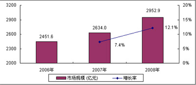 圖3 2006-2008年中國通信設備市場規(guī)模及增長
