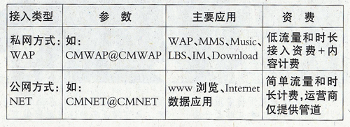 目前,運(yùn)營商采用兩種接入方式(WAP和NET)接入移動(dòng)互聯(lián)網(wǎng),如表所示:
