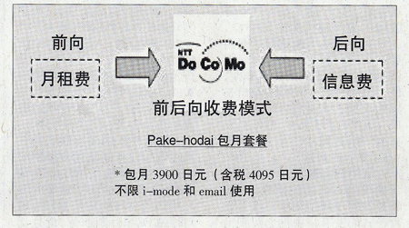 當(dāng)然,移動(dòng)互聯(lián)網(wǎng)運(yùn)營不僅可以前向向用戶收費(fèi),還可以采取后向的廣告收費(fèi)模式,如圖NTT DoCoMo的數(shù)據(jù)業(yè)務(wù)資費(fèi)模式: