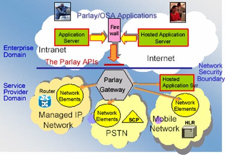從圖中可以看到,OSA的基本思路是,把電信網(wǎng)絡(luò)的服務(wù)抽象成為一個特定的接口。這個接口的名稱現(xiàn)在被我們稱為Parlay。建立在OSA基礎(chǔ)之上的服務(wù)可以利用Parlay這個接口很容易的使用電信網(wǎng)絡(luò)中的服務(wù)而不用去關(guān)心這些接口是如何實現(xiàn)的。例如我們的一個多媒體服務(wù)希望給一個用戶發(fā)送一條短信以通知他某個事件的發(fā)生,那么這個服務(wù)需要做的是告訴Parlay這個接口需要給哪個用戶發(fā)送什么樣的內(nèi)容的信息,而不需要了解在移動網(wǎng)絡(luò)中原來是使用SMPP這樣的協(xié)議來實現(xiàn)短信的傳送的,又或者也不用去考慮在一個IP網(wǎng)絡(luò)中我們可以用SMTP這樣的協(xié)議來實現(xiàn)他。