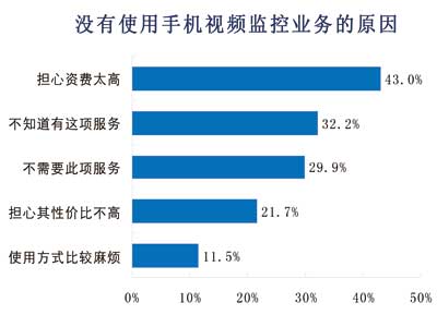諾達(dá)咨詢(xún)對(duì)沒(méi)有使用手機(jī)視頻監(jiān)控的用戶(hù)原因進(jìn)行調(diào)查,結(jié)果表明,43%的用戶(hù)擔(dān)心資費(fèi)太高,其次對(duì)手機(jī)監(jiān)控不了解和不需要此項(xiàng)服務(wù)的用戶(hù)各占32%、30%。22%的用戶(hù)擔(dān)心性?xún)r(jià)比不高,12%用戶(hù)因?yàn)槭褂帽容^麻煩而不選擇手機(jī)視頻監(jiān)控服務(wù)。