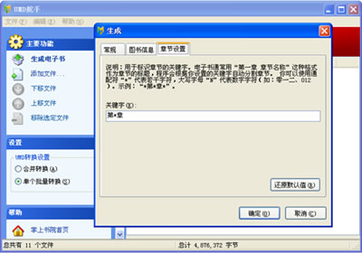 對(duì)于單個(gè)批量轉(zhuǎn)換的用戶而言,UMD舵手擁有智能斷章功能,完美解決了TXT電子書在手機(jī)上無法分章的難題。在“章節(jié)設(shè)置”選項(xiàng)卡中輸入用于制作章節(jié)目錄的關(guān)鍵字。例如:1、“第一章華山論劍”,則輸入的關(guān)鍵字可為:“第*章”;“一、華山論劍”,則輸入的關(guān)鍵字可為:“N、”;“【華山論劍】”,則輸入的關(guān)鍵字可為:“【*】”;“1-3-5節(jié):華山論劍”,則輸入關(guān)鍵字可為:“N-N-N