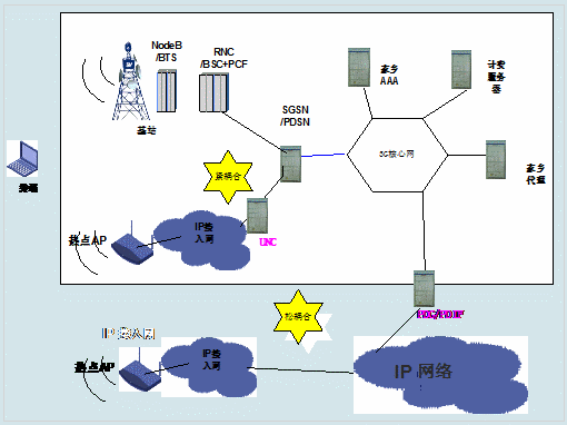 松耦合方式的代表方法是3GPP、3GPP2規(guī)定的WLAN與3G融合的方法。為了達到從WLAN接入也能夠訪問移動網(wǎng)絡增值業(yè)務的目的,需要在IP網(wǎng)絡和移動核心網(wǎng)之間增加一個業(yè)務網(wǎng)關,該網(wǎng)關不會像UNC一樣作協(xié)議轉換的工作,主要作用類似移動網(wǎng)絡增值業(yè)務的接口人,如果要訪問移動網(wǎng)絡的增值業(yè)務需要經(jīng)過這里進行業(yè)務把關和控制。該設備在3GPP中被稱為PDG(Packet