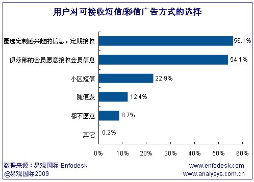 從用戶對(duì)短信廣告的接受程度來(lái)看,用戶對(duì)于自己感興趣領(lǐng)域的短信廣告并不反感,甚至樂于接受或定制。根據(jù)易觀國(guó)際Enfodesk發(fā)布的用戶調(diào)研數(shù)據(jù),56.1%的用戶愿意定制自己感興趣的信息,54.1%的用戶愿意接受會(huì)員信息,只有8.7%的用戶不愿意接受任何形式的短信/彩信廣告。但是這類用戶樂于接受的短信廣告反而一般有固定的端口號(hào),更容易被攔截,因此易觀國(guó)際(Analysys