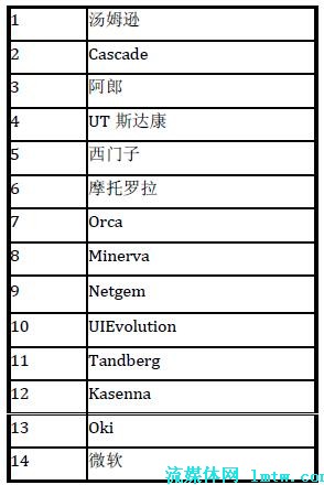 在中國市場上,UT 斯達(dá)康和中興公司暫時領(lǐng)先于其他公司。其中,UT 斯達(dá)康在海外也有不俗的表現(xiàn),如在印度和日本市場等;華為公司可以借助其整體解決方案的實力,有機會在下一代基于IMS 的IPTV 解決方案中脫穎而出。MRG 曾經(jīng)在2007 年3 月公布過一個市場調(diào)查,對IPTV 中間件及其市場影響力進(jìn)行了一個排名,具體的結(jié)果見表1。
