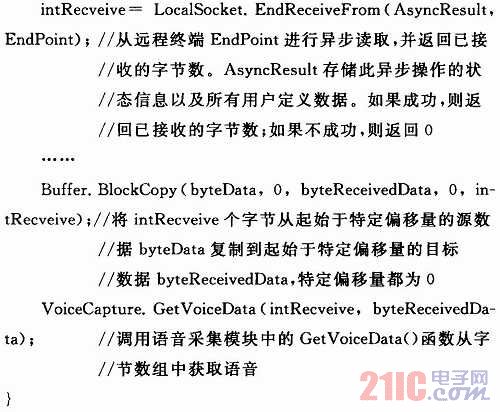 數(shù)據(jù)接收函數(shù)的功能主要是調(diào)用GetVoiceData()函數(shù)從網(wǎng)絡中接收語音數(shù)據(jù)并放入緩沖區(qū)。代碼如下: