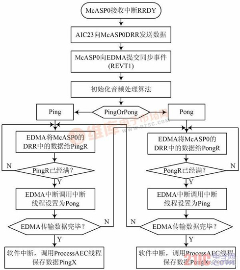 基于DSP 的實(shí)時(shí)處理的實(shí)現(xiàn),本文將AIC23 采集到的數(shù)據(jù)先存儲(chǔ)到SDRAM 中,在需要處理的時(shí)候利用EDMA 實(shí)現(xiàn)Ping Pong 緩沖,將待處理的數(shù)據(jù)分批搬運(yùn)到片內(nèi)存儲(chǔ)器,結(jié)合高速緩存和片內(nèi)內(nèi)存設(shè)計(jì)合適的數(shù)據(jù)結(jié)構(gòu),并將數(shù)據(jù)對(duì)齊,這樣大大減小了數(shù)據(jù)搬移帶來(lái)的開(kāi)銷(xiāo)。