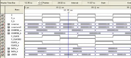 使用的信號包括:數(shù)據(jù)信號data_a,dat_b;讀寫有效信號wren_a,wren_b;地址信號address_a,address_b;時鐘信號clock_a,clock_b;輸出數(shù)據(jù)信號q_a,q_b。可以看到所有的信號都是成對出現(xiàn)的,就是為了進(jìn)行乒乓方式的數(shù)據(jù)傳輸。分成了兩個RAM區(qū)域,A和B,相當(dāng)于前面講乒乓方式里的數(shù)據(jù)緩沖模塊1和2。兩個RAM塊是交替著讀寫(由I_a和I_b決定),輸出數(shù)據(jù)流也是由I決定。剛說到寫時鐘是13.5M,讀時鐘是27M,所以clock_a和clock_b必須是讀寫時鐘切換著輸入,而且地址的計數(shù)也不一樣,寫周期時候地址增加的時鐘是13.5M,讀周期地址增加的時鐘是27M。所以每行的數(shù)據(jù)讀了兩遍,相當(dāng)于隔行變逐行。圖6在Qartus II下RAM的乒乓操作功能仿真圖:
