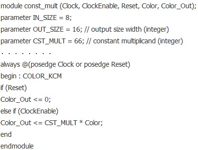 用Verilog HDL編寫代碼,實現(xiàn)YUV到RGB的轉(zhuǎn)化。其中共包括3個模塊跟1個仿真激勵。在模塊const_mult中,主要實現(xiàn)乘法運算,主要代碼如下: