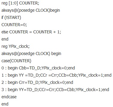 以上代碼完成了圖3的功能,輸入的信號名為TD_D,輸出的三路信號是Cbb,YY,Crr。注意到還有個YPix_clock,實際上是27M的2分頻,這個時鐘非常有用,在下面將詳細(xì)闡述。