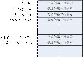 第1種:將一幀的數(shù)據(jù)存儲下來,根據(jù)奇偶場的不同(區(qū)分可以根據(jù)XY),在寫周期的時候,因為奇場的行之間有偶場的信號,所以寫數(shù)據(jù)的時候需要跳地址寫,根據(jù)行同步信號(或者SAV也可以)來區(qū)分行,換行的時候地址要加額外的720(用來存放夾雜在奇場信號中的偶場信號),直到出現(xiàn)偶場信號(也就是XY=1)地址切換為初始基地址加720,其余的同奇行的處理方法,具體的地址分配表參照圖4。