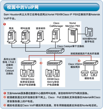 SHSU到目前為止已經(jīng)將1600 部IP電話由Cisco CallManager遷移到Asterisk上,后者運行IETF標準的SIP。Asterisk的功能將分布在幾臺冗余Dell服務器上:其中兩臺作為冗余PSTN網(wǎng)關;