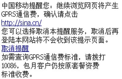 從2007年5月17日起,通過手機訪問WAP網(wǎng)站,中國移動向用戶主動提供一個收費提示頁面,提醒用戶“正在使用手機上網(wǎng)業(yè)務(wù),若繼續(xù)瀏覽網(wǎng)頁,將會產(chǎn)生GPRS通信費”。但打開中國移動夢網(wǎng)頁面,則不會有上述提示。