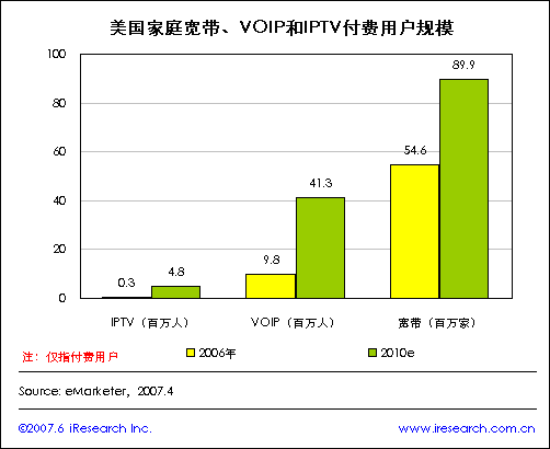 iResearch艾瑞市場(chǎng)咨詢(xún)公司根據(jù)eMarketer發(fā)布的數(shù)據(jù)整理顯示,2006年美國(guó)IPTV付費(fèi)用戶(hù)規(guī)模達(dá)到30萬(wàn)人,該公司預(yù)測(cè)到2010年將達(dá)到480萬(wàn)人。2006年美國(guó)VOIP付費(fèi)用戶(hù)規(guī)模達(dá)到980萬(wàn)人,預(yù)計(jì)到2010 年將達(dá)到4130萬(wàn)人。2006年美國(guó)家庭寬帶付費(fèi)規(guī)模達(dá)到5460萬(wàn)家,預(yù)計(jì)到2010年達(dá)到8990萬(wàn)家。