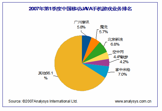 從企業(yè)實(shí)力和市場份額來看,目前手機(jī)游戲市場主要有三股力量組成,以空中等為代表的全業(yè)務(wù)線電信增值服務(wù)商(SP),以新浪等為代表的互聯(lián)網(wǎng)門戶綜合服務(wù)商,以米格、魔龍為代表的專業(yè)手機(jī)游戲產(chǎn)品與服務(wù)提供商(SP)。根據(jù)中國移動“百寶箱”第1季度收入數(shù)據(jù),易觀注意到,掌中米格、北京新浪、廣州摩訊位列前三,前三名占據(jù)了近20%的市場份額。夢網(wǎng)手機(jī)游戲精品業(yè)務(wù)的三家服務(wù)提供商第一季度收入排名為:米格、新浪、空中網(wǎng)!