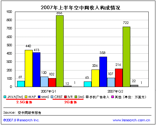 空中網(wǎng)2007年第二季度財(cái)報(bào)數(shù)據(jù)顯示,第二季度空中網(wǎng)的總收入1695.9萬美元,同比負(fù)增長43.6%,環(huán)比負(fù)增長15.7%。與第一季度相比在空中網(wǎng)兩個(gè)產(chǎn)品平臺(tái)的主要2G業(yè)務(wù)和2.5G的業(yè)務(wù)收入都出現(xiàn)了不同程度的下降,但2G業(yè)務(wù)中的IVR業(yè)務(wù)收入則出現(xiàn)了大幅上升。