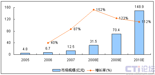 馳昂咨詢(Sinotes)發(fā)布的《2007-2008年中國移動增值業(yè)務(wù)市場研究年度報告》顯示,截止至2007年底,中國移動即時通信(IM)市場規(guī)模已經(jīng)達到12.5億元。而隨著3G時代的來臨,在電信運營商的積極推動下,國內(nèi)移動IM市場必將步入快速增長期,預(yù)計未來三年增長率都將在100%以上。
