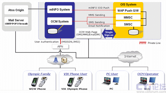 奧運社區(qū)傳送服務(wù),簡稱OCM,是用于競賽運營的移動通信服務(wù)機(jī)構(gòu),OCM的服務(wù)包括使用短信和彩信的信息群發(fā)以及使用即時信息和電子郵件的社區(qū)通信服務(wù)。屆時,三星北京2008WOW將根據(jù)用戶的喜好設(shè)置提供個性化的奧運信息,分為競賽、新聞、信息、火炬接力和“我的WOW”——每個WOW用戶可以根據(jù)自身的喜好定制特殊的信息服務(wù)。