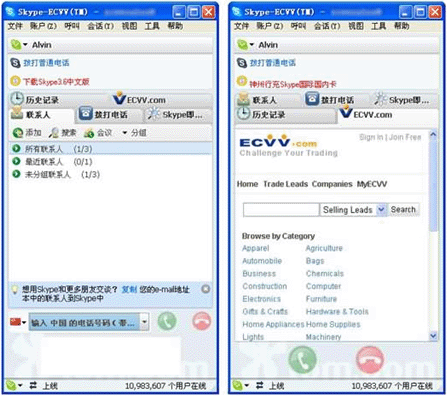 ECVV一向以全球的進(jìn)出口企業(yè)為服務(wù)對(duì)象,用戶群遍及220多個(gè)國家和地區(qū),此番結(jié)合Skype于全球商務(wù)通訊領(lǐng)域里的資源優(yōu)勢,不僅豐富了ECVV的服務(wù)功能,向用戶提供信息的同時(shí)更使貿(mào)易雙方能夠?qū)崟r(shí)交流,從而使貿(mào)易信息服務(wù)更趨先進(jìn)與立體化,同時(shí)還使ECVV的用戶群得到更深度的擴(kuò)展。