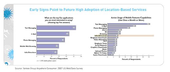 當(dāng)美國(guó)聯(lián)邦通信委員會(huì)(FCC)在2001年強(qiáng)制要求實(shí)施911增強(qiáng)功能時(shí),移動(dòng)行業(yè)就開(kāi)始通過(guò)將導(dǎo)航服務(wù)引入大眾市場(chǎng)來(lái)獲利。7年后,絕大多數(shù)手機(jī)都集成了GPS功能,幾大主要的移動(dòng)運(yùn)營(yíng)商也都計(jì)劃在年內(nèi)推出至少一項(xiàng)基于GPS 的導(dǎo)航應(yīng)用。揚(yáng)基集團(tuán)認(rèn)為,2008年正在成為美位置服務(wù)的轉(zhuǎn)折點(diǎn)。