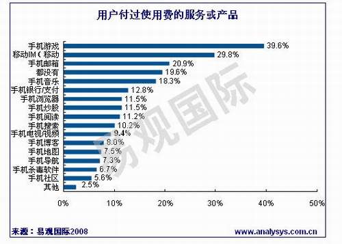 據(jù)易觀國(guó)際《中國(guó)手機(jī)應(yīng)用市場(chǎng)用戶調(diào)研報(bào)告2008》研究發(fā)現(xiàn),用戶付過使用費(fèi)的手機(jī)應(yīng)用服務(wù)及產(chǎn)品中,手機(jī)游戲、移動(dòng)IM和手機(jī)郵箱的比例較高。其中39.6%的手機(jī)應(yīng)用用戶付費(fèi)玩過手機(jī)游戲,29.8%的用戶曾經(jīng)為移動(dòng)IM付費(fèi),而手機(jī)郵箱的付費(fèi)用戶將達(dá)20%。其他手機(jī)應(yīng)用產(chǎn)品或服務(wù)中,付費(fèi)用戶的比例相當(dāng),均在10%左右,但是有近20%的用戶沒有用過任何的付費(fèi)服務(wù)或產(chǎn)品。
