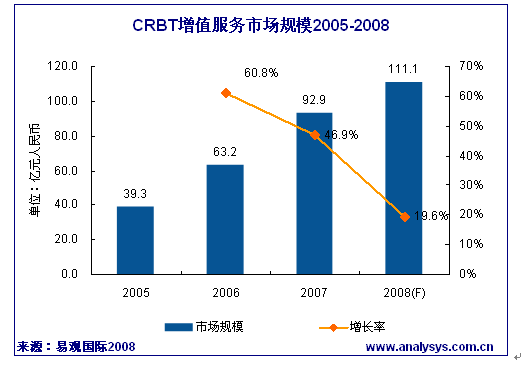 CRBT市場(chǎng)在2007年取得了46.9%的年度增長(zhǎng),預(yù)計(jì)2008年CRBT業(yè)務(wù)的發(fā)展速度將進(jìn)一步放緩,但是運(yùn)營(yíng)商的一些舉措如設(shè)置彩鈴的使用時(shí)限、增加按鍵復(fù)制功能等,將有助提高用戶ARPU值。