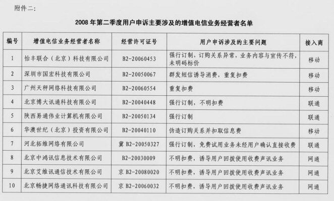 2.2008年二季度用戶申訴主要涉及的增值電信業(yè)務經營者名單