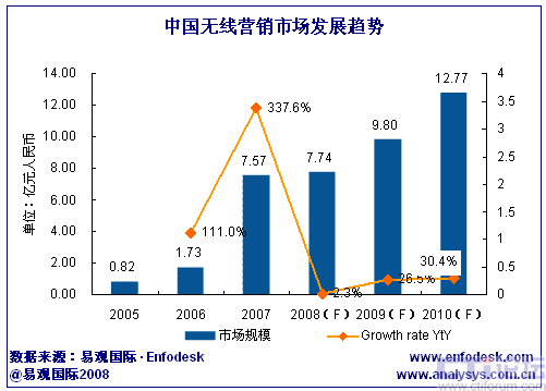 易觀國際(Analysys International)預(yù)計(jì),2010年中國無線營銷整體市場規(guī)模將增至12.77億。其中增長最迅速的細(xì)分市場為WAP類廣告,預(yù)計(jì)2010年,WAP廣告在整體市場中所占份額將達(dá)56.7%,2007年至2010年WAP廣告市場收入平均復(fù)合增長率72.1%。WAP市場的增長動力將逐步由業(yè)內(nèi)廠商向傳統(tǒng)行業(yè)廠商擴(kuò)展。