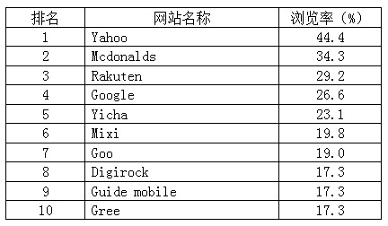 VRI的數(shù)據(jù)顯示,在手機(jī)網(wǎng)站瀏覽率TOP10的排名中,雅虎以44.4%的瀏覽率位居第一,google搜索以26.6%的瀏覽率位居第四,易查搜索以23.1%的瀏覽率緊隨其后,位居第五。雅虎作為綜合性門(mén)戶網(wǎng)站,不僅包括雅虎搜索,還包括雅虎電子商務(wù)。而麥當(dāng)勞手機(jī)網(wǎng)站以34.3%瀏覽率位居第二,用戶主要用于下載電子優(yōu)惠券。第三名是日本最大的電子商務(wù)網(wǎng)站樂(lè)天市場(chǎng),其瀏覽率為29.2%。