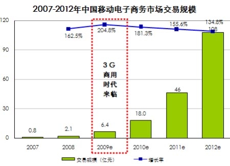 根據(jù)艾瑞咨詢即將發(fā)布的《2008-2009年中國移動電子商務(wù)行業(yè)發(fā)展報告》數(shù)據(jù)表明,08年中國移動電子商務(wù)市場交易規(guī)模為2.1億元,09年隨著3G商用時代到來,以及無線與傳統(tǒng)電子商務(wù)企業(yè)的紛紛試水,預(yù)計(jì)交易規(guī)模將達(dá)6.4億,同比增長約205%。艾瑞預(yù)計(jì)2012年移動電子商務(wù)交易規(guī)模將達(dá)到108億元,發(fā)展?jié)摿薮蟆?br />