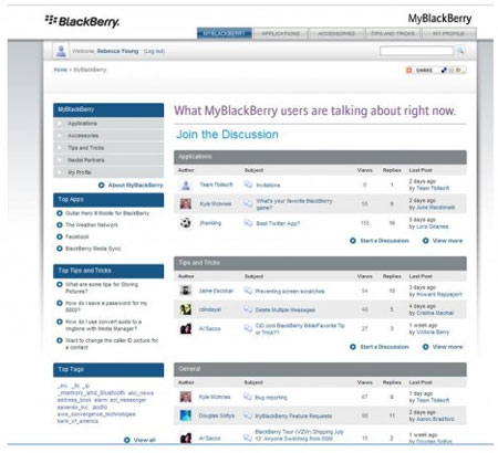 從某種程度而言,MyBlackBerry并不是一個(gè)真正的社交網(wǎng)站,而更像一個(gè)用戶留言板。網(wǎng)站具有一定的針對(duì)性,允許使用同型號(hào)設(shè)備的用戶進(jìn)行交流。例如,使用BlackBerry Storm的用戶可以與其他Storm用戶聊天或共享信息。