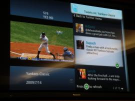 在使用電視窗件時,電視機(jī)屏幕將被分為左右兩塊,Twitter消息顯示在其中一個屏幕中。這一應(yīng)用在觀看重大事件或者體育賽事時可以帶來非常精彩的體驗(yàn)。比如觀看紐約楊基隊(duì)的一場棒球比賽,用戶可以同時閱讀洋基隊(duì)有關(guān)的Twitter短消息。