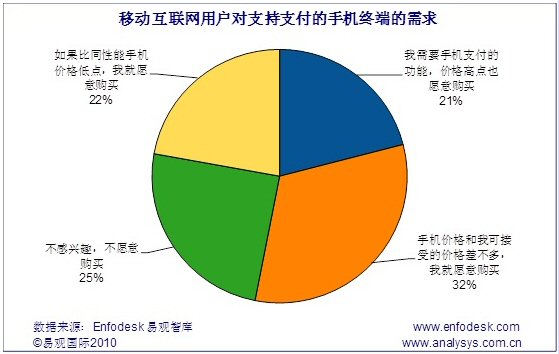 據(jù)Enfodesk易觀智庫(kù)最新報(bào)告《中國(guó)移動(dòng)互聯(lián)網(wǎng)市場(chǎng)用戶研究報(bào)告2010》研究發(fā)現(xiàn),目前在移動(dòng)互聯(lián)網(wǎng)用戶中,有75%的用戶對(duì)具有移動(dòng)支付功能的手機(jī)表現(xiàn)出明顯的興趣,其中影響不大,完全靠性價(jià)比決定是否購(gòu)買的用戶占比最多,約為32%,只有在移動(dòng)具備支付功能的手機(jī)和可接受價(jià)格相近時(shí)才會(huì)購(gòu)買。另外21%的人由于對(duì)移動(dòng)支付業(yè)務(wù)需求程度較高,愿意為此付出更高價(jià)格,其他22%的用戶則在比同性能手機(jī)價(jià)格低些之后,才會(huì)進(jìn)行消費(fèi)。除此之外,還有25%的用戶對(duì)于具備支付功能的手機(jī)沒有絲毫興趣,不愿意購(gòu)買。