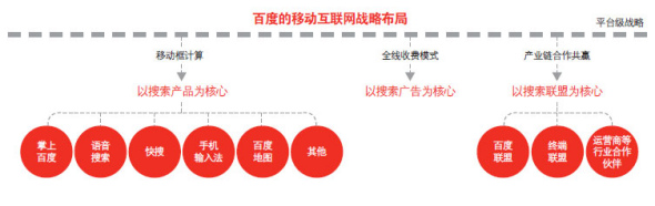 百度無線的戰(zhàn)略仍將以搜索作為核心!鞍俣仍跓o線方面的核心發(fā)展規(guī)劃就三條:第一條,以搜索產(chǎn)品為核心布局移動框計算。第二條,以搜索廣告位核心,探索全線收費(fèi)模式。第三條,以搜索聯(lián)盟為核心,推動產(chǎn)業(yè)鏈合作共贏!边@是百度的官方說法。