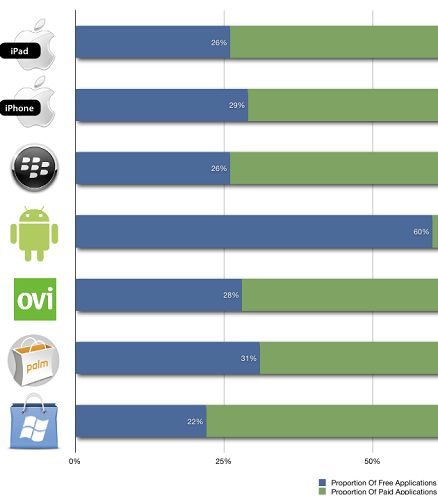 Windows市場中的免費(fèi)應(yīng)用程序比例最少,僅占其應(yīng)用程序總量的22%;其次為蘋果iPad應(yīng)用程序商店,其免費(fèi)應(yīng)用程序比例為26%。iPhone應(yīng)用程序商店中,免費(fèi)應(yīng)用程序的比例為29%。在付費(fèi)應(yīng)用程序方面,Android市場及Palm公司應(yīng)用程序商店中前100名熱銷應(yīng)用程序價格平均值高于所有收費(fèi)應(yīng)用程序價格均值。