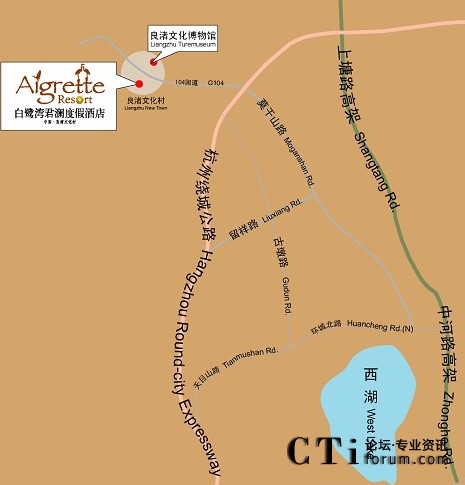 杭州城站火車站——西湖大道(入口)——中和路高架(出口)——勾運(yùn)路——莫干山路(過(guò)勾莊收費(fèi)站)——新104國(guó)道(大陸出口)——良渚文化村——杭州白鷺灣君瀾度假酒店
