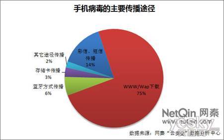 感染途徑方面,《2010年中國(guó)大陸地區(qū)手機(jī)安全報(bào)告》指出,據(jù)網(wǎng)秦“云安全”數(shù)據(jù)分析中心統(tǒng)計(jì),當(dāng)前通過手機(jī)訪問wap和www網(wǎng)站感染病毒的比率達(dá)75%;通過短信、彩信感染病毒的比率占14%;通過藍(lán)牙傳輸方式感染病毒的比率占6%;通過存儲(chǔ)卡等途徑感染病毒的比率占3%;另外2%的用戶則是被其它傳播途徑的病毒感染。其中聯(lián)網(wǎng)感染病毒的機(jī)率最大,成為用戶面臨的最主要威脅。