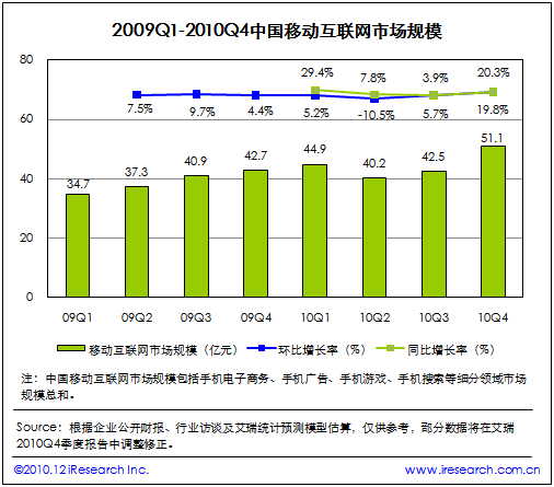 根據(jù)艾瑞咨詢即將發(fā)布的2010年第四季度中國(guó)移動(dòng)互聯(lián)網(wǎng)市場(chǎng)監(jiān)測(cè)數(shù)據(jù)顯示,2010Q4中國(guó)移動(dòng)互聯(lián)網(wǎng)市場(chǎng)整體規(guī)模達(dá)到51.1億,同比增長(zhǎng)19.8%,環(huán)比增長(zhǎng)20.3%。艾瑞咨詢分析認(rèn)為,本季度電信運(yùn)營(yíng)商對(duì)計(jì)費(fèi)通道治理開(kāi)始收尾,移動(dòng)增值市場(chǎng)整體復(fù)蘇。同時(shí)手機(jī)電子商務(wù)、手機(jī)游戲業(yè)務(wù)領(lǐng)域取得良好市場(chǎng)表現(xiàn),受手機(jī)應(yīng)用商店、位置簽到服務(wù)等新型手機(jī)業(yè)務(wù)創(chuàng)新的帶動(dòng),移動(dòng)互聯(lián)網(wǎng)規(guī)?傮w攀升,投融資比重增加。