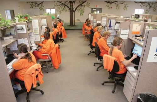 但古德溫邁出了回歸體面人生的艱難步伐,并已獲得了一份工作,4月份刑滿后可上任,這一切都多虧了一家名為威爾帝電信(Televerde)的公司。該公司在佩里維爾監(jiān)獄運(yùn)營著四個(gè)呼叫中心,包括250名輪候上班的身著橘黃色連身衣的“女士”(員工們很享受這個(gè)稱呼),員工必須接受脫衣搜查,有時(shí)還要接受保安的盤問。但一旦戴上耳機(jī),她們就進(jìn)入了另一個(gè)世界!霸谀抢锟梢灾厥白宰稹!惫诺聹乇硎,她已為出獄后的生活攢下了8,000美元的儲蓄。威爾帝電信是一家私營企業(yè),董事長詹姆斯·胡克(James